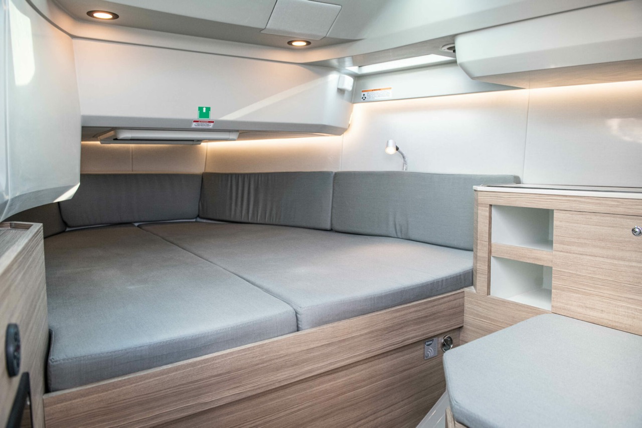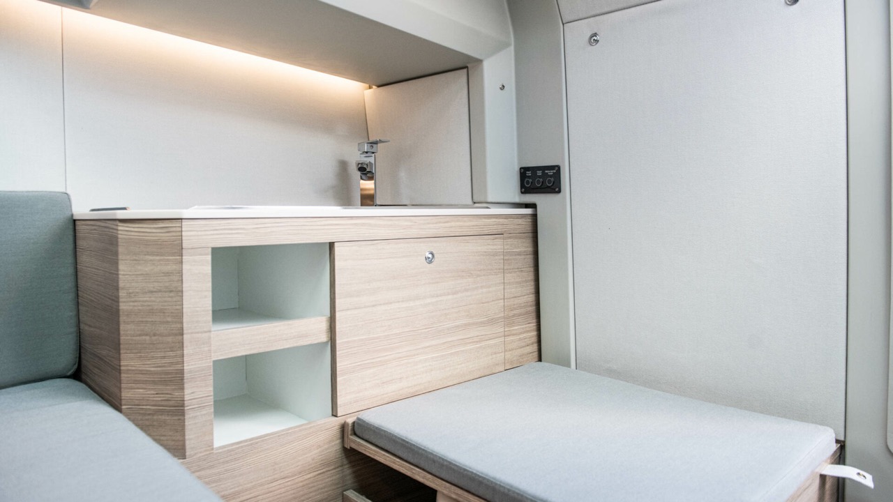 The large, airy front cabin is your next favorite hideout equipped with a two-person regular-size sleeping berth and plenty of natural light coming through skylight and hatches that optically enlarges the entire space.