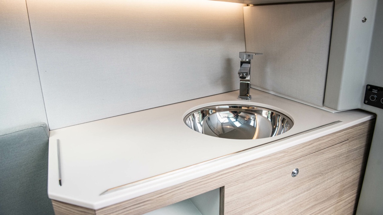 A sanitary corner with a toilet and an additional sink also fits in to make your mornings onboard hassle-free.