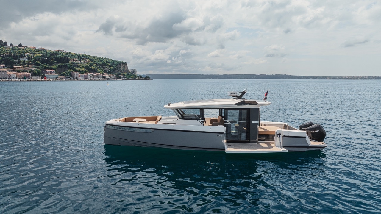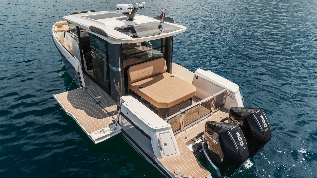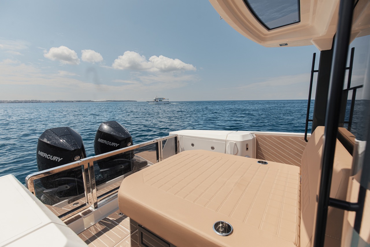 The boat boasts versatile convertible areas, such as a U-shaped lounge at the bow and an aft bench with an optional sun pad. These features make it ideal for entertaining up to eight guests in style and comfort.