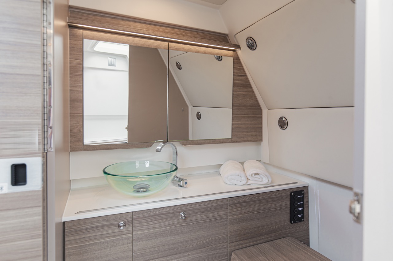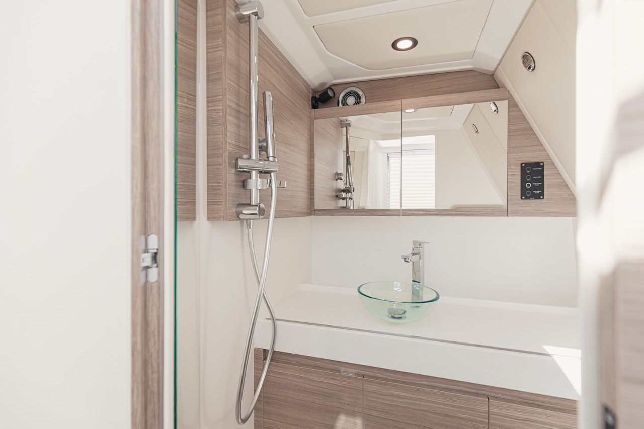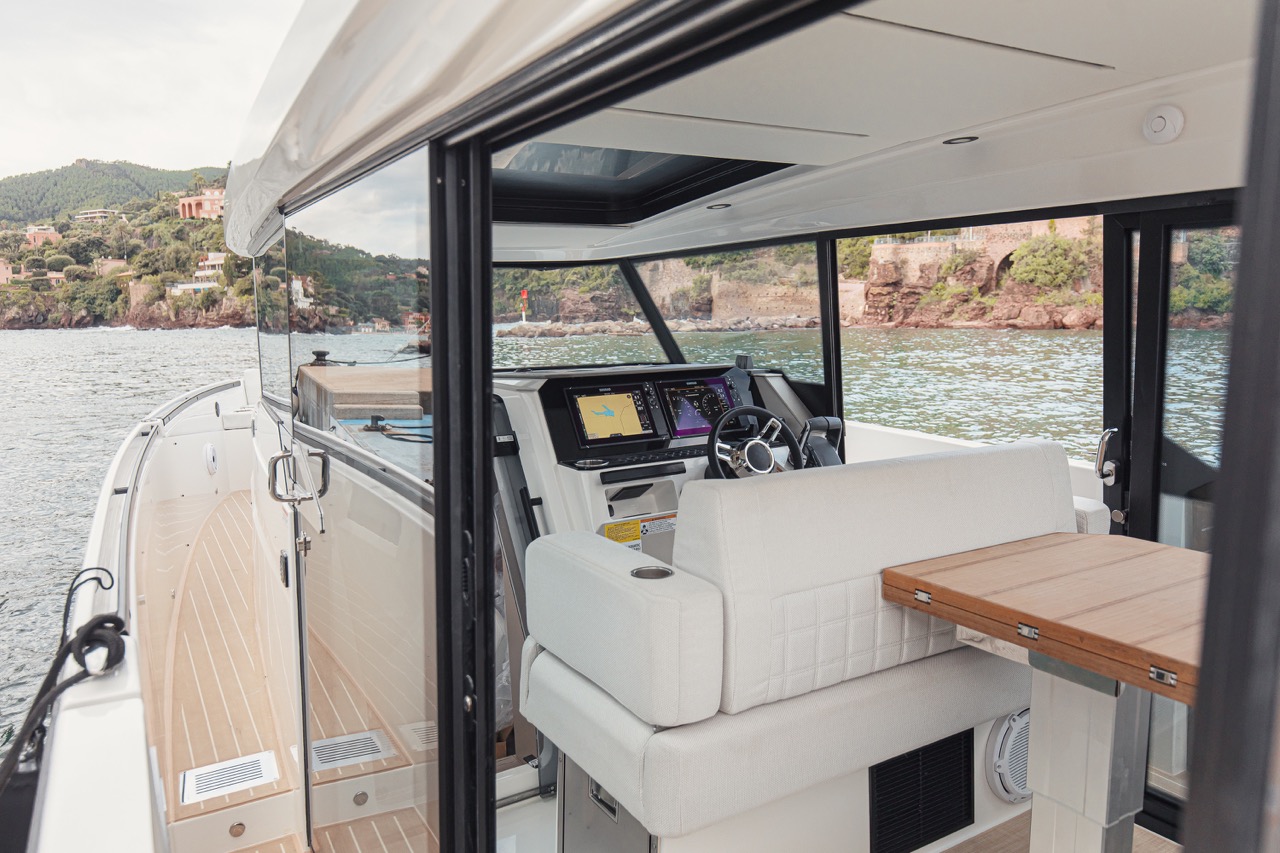 The ergonomically designed helm station features twin Simrad displays, offering intuitive navigation and full control over the boat’s systems. It enhances the boating experience, making it user-friendly and efficient for both seasoned captains and beginners.