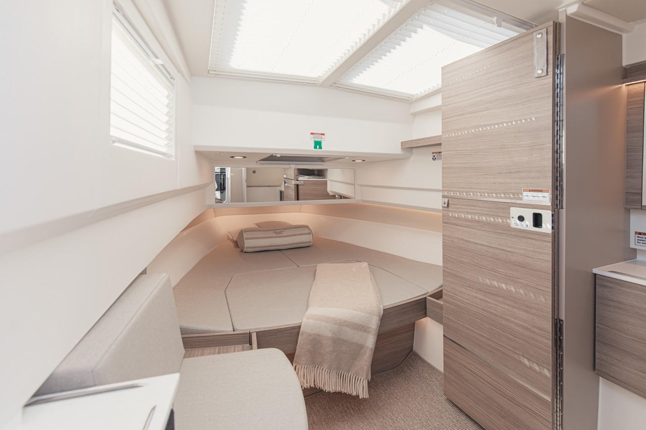 The lower deck includes a spacious forward double cabin with a separate toilet, and an aft cabin for two, both with large windows that flood the interior with natural light.