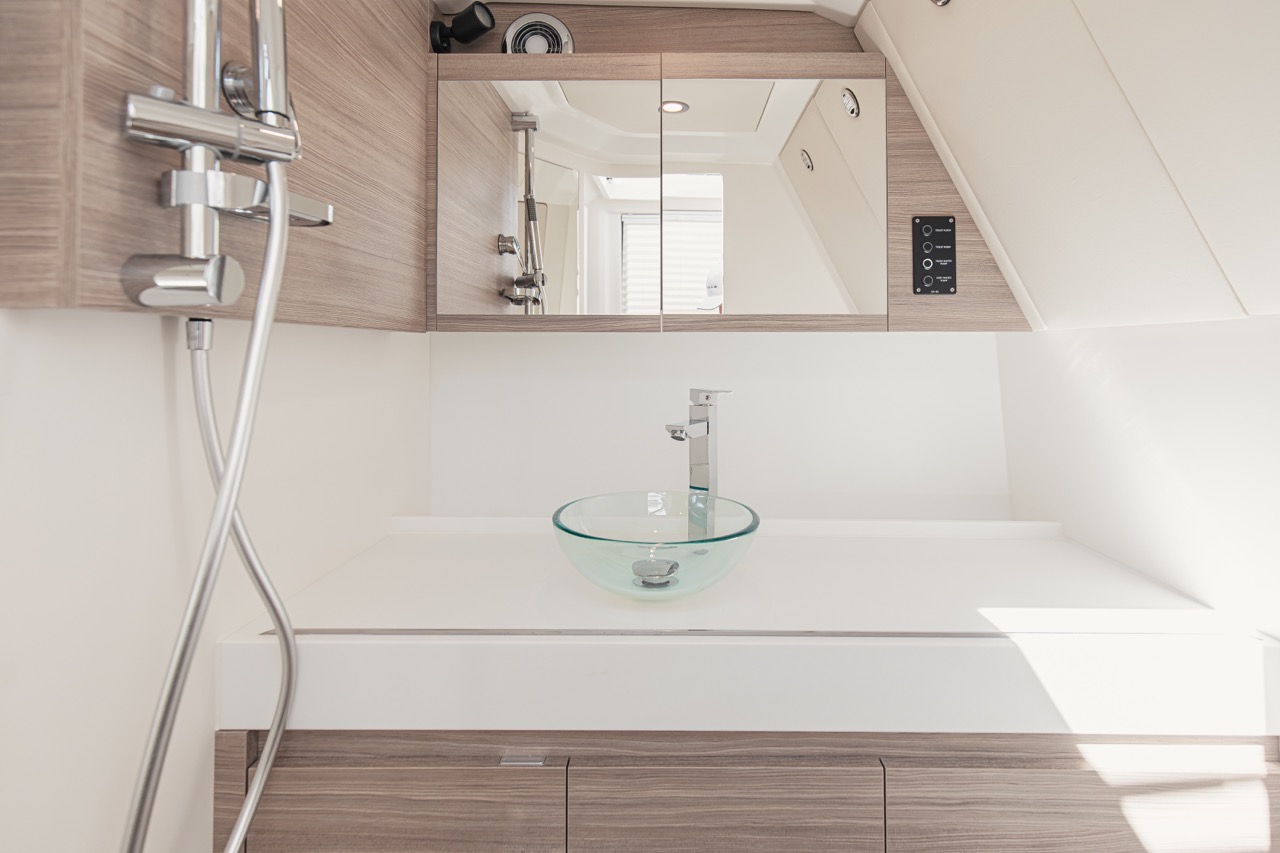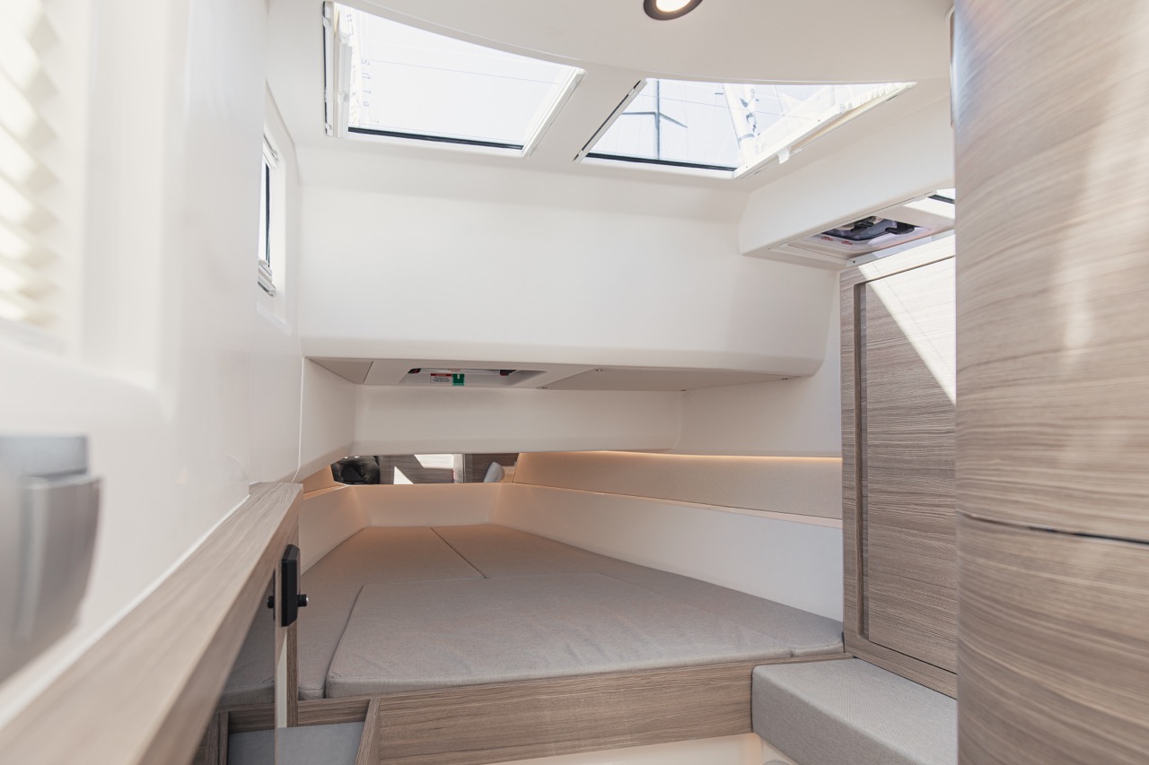 Below deck, two staircases lead to the double cabins – forward and amidships – sharing a bathroom, with an optional third berth for kids.