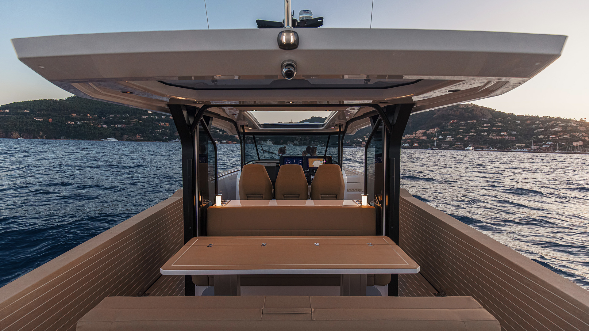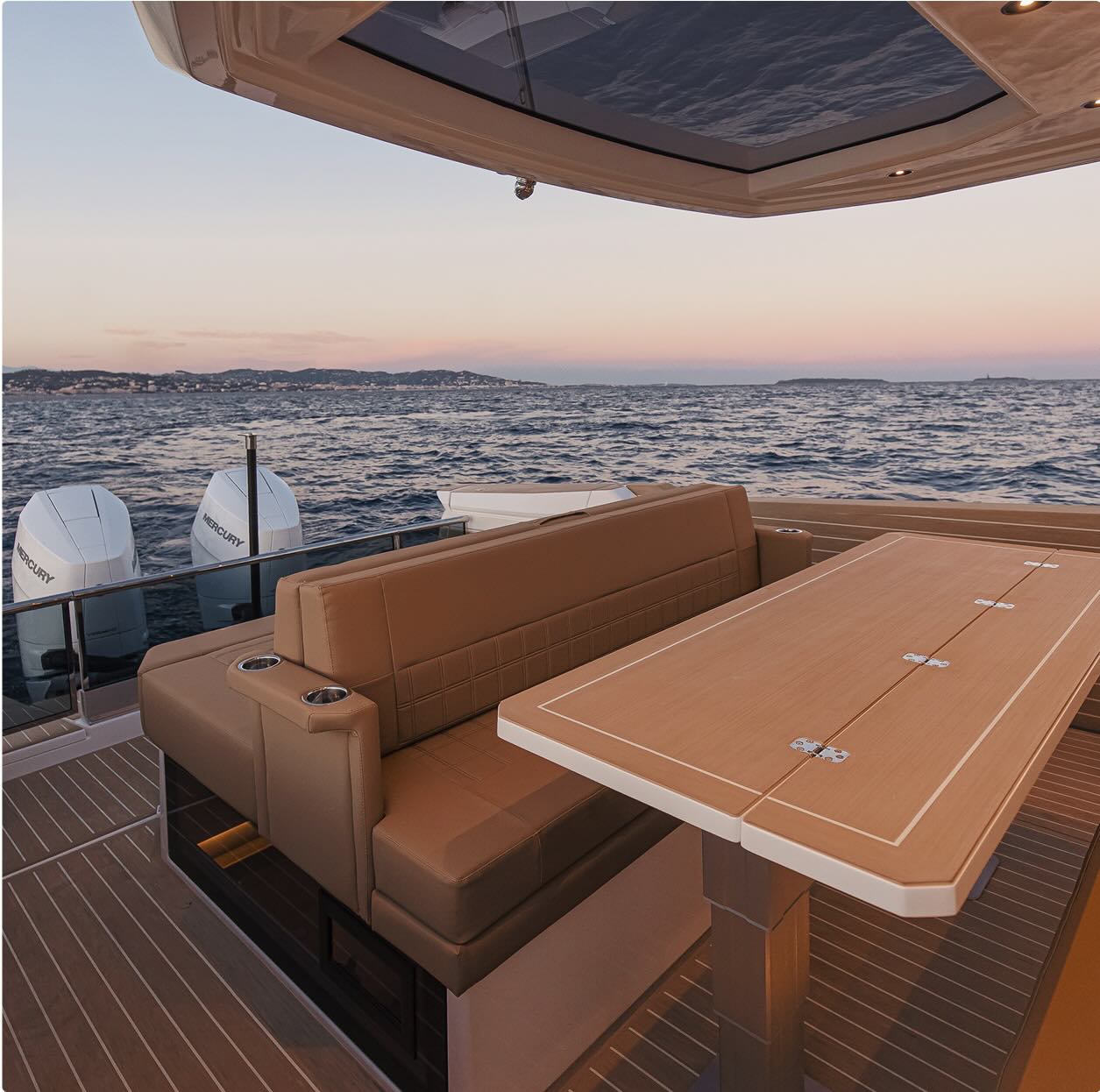 The open, semi-walkaround deck lets everyone flow bow to stern; at anchor, the drop-down terraces widen the boat and bring you right to the water. Convertible seating fore and aft—dinette to sunbed up front, twin sofas to a full lounge aft—switches from lunch to lounging in seconds.