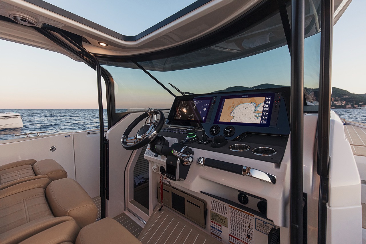 Wide sightlines, supportive seats, and fingertip controls keep you comfortable and in command on long runs. The redesigned dash features floating dual displays and a clean layout, while the full-height windshield meets the roof to block wind and spray—so you stay focused on the course, not the elements.