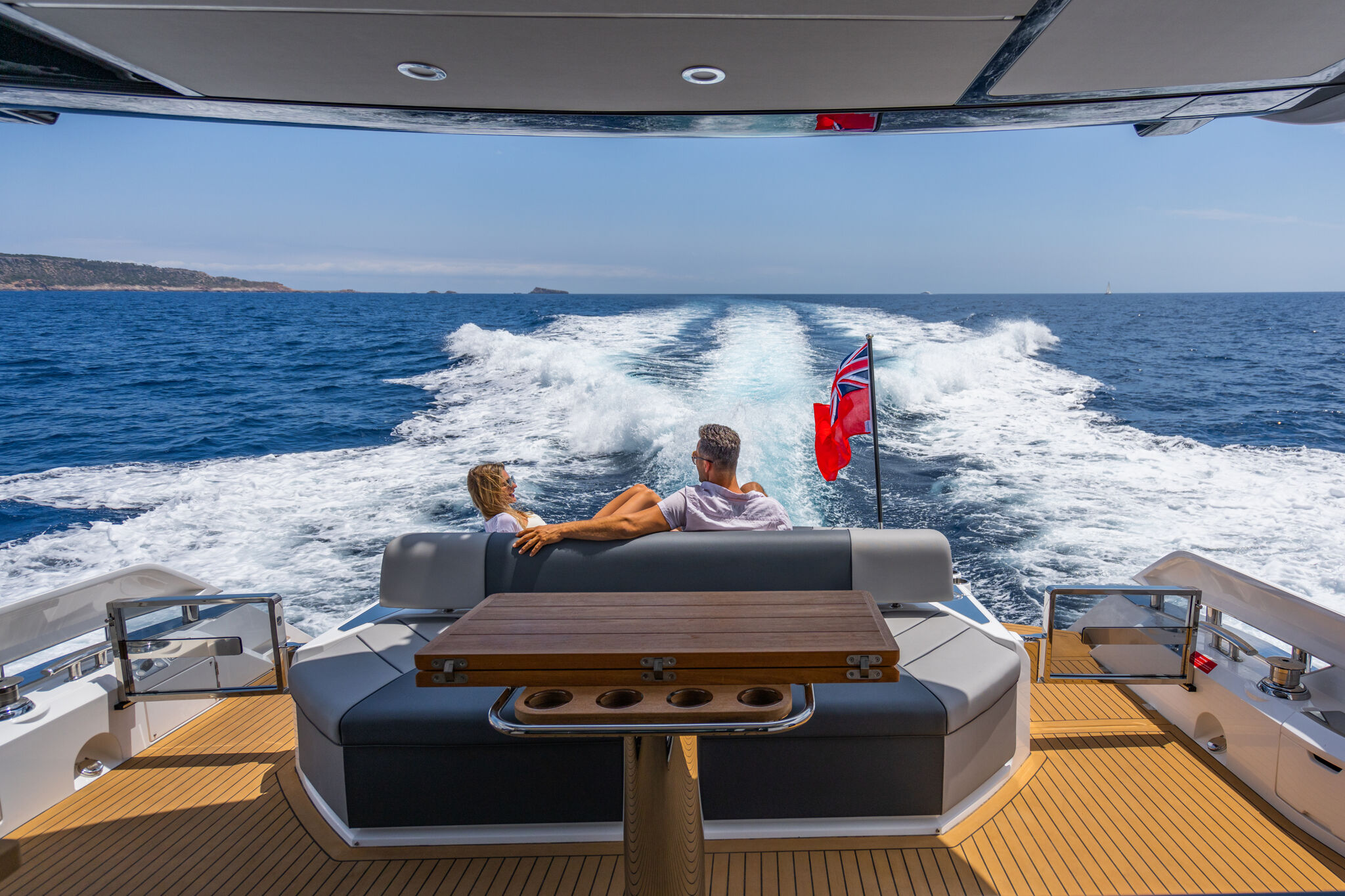 Take your Sport Yacht to new heights by carrying the tender on the bathing platform and reconfiguring the vacated space as a dedicated ‘Beach Club’ – with direct sea access, bar, fridge, BBQ and free-standing seating. The perfect area for those happiest close to the water. With speeds of up to 35 knots, the 65 Sport Yacht cuts an equally impressive figure on the open water. Altogether, the experience is one of pure adrenaline, akin to driving a high-performance convertible supercar.