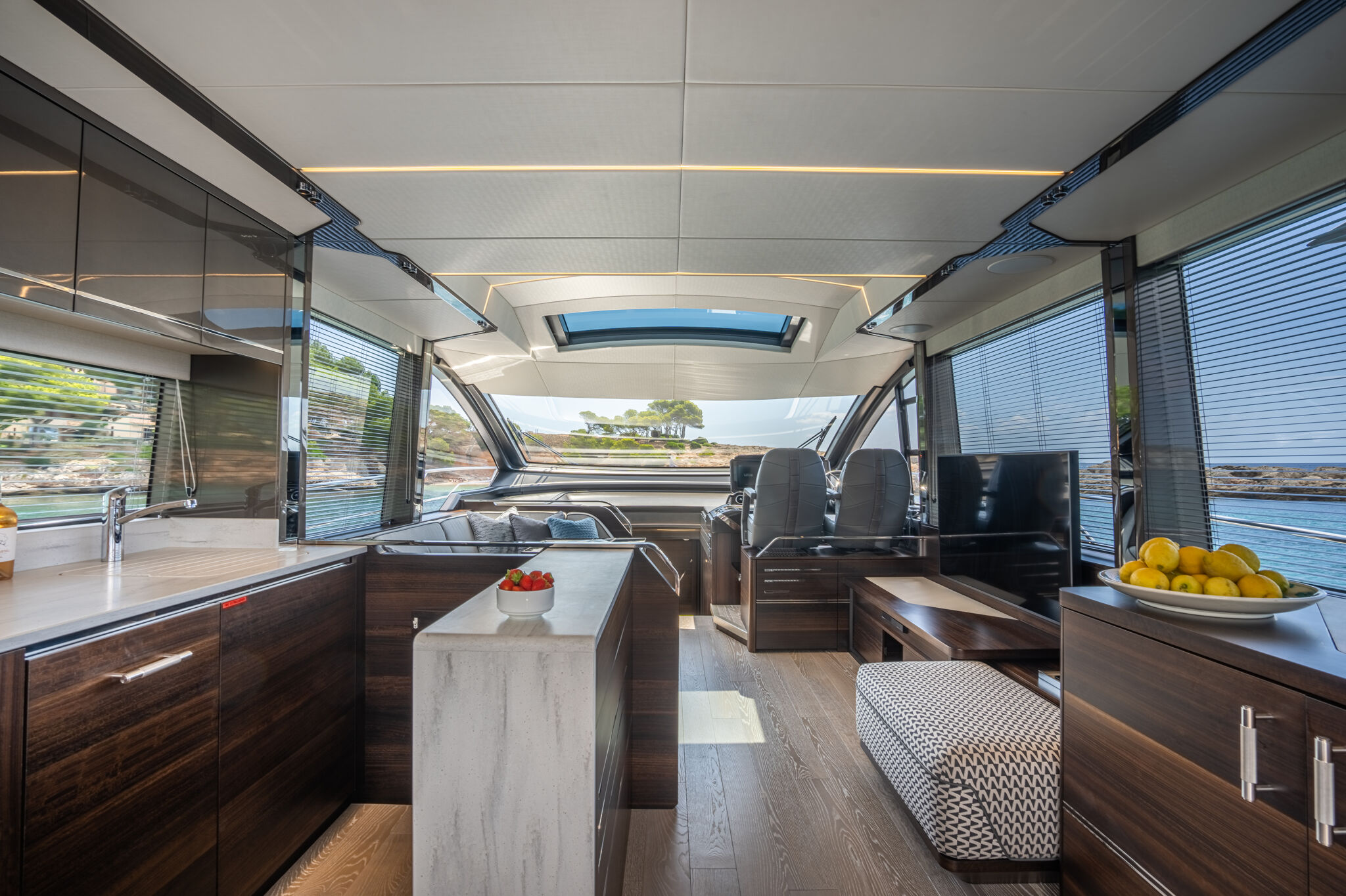 The SkyHelm™, complete with IPS docking joystick, can be used in an upright position for low-speed manoeuvring or lowered to fall perfectly into outstretched arms when sat low in the bespoke helm seats cossetted by carbon fibre backrests and an integrated centre console. The modular layout allows for various specifications and enhancements, with space that adapts seamlessly to all kinds of socialising and adrenaline-seeking. Three cabins, including a full-beam master stateroom, can accommodate up to six guests in luxurious comfort, with a fully appointed crew cabin located forward of the garage.