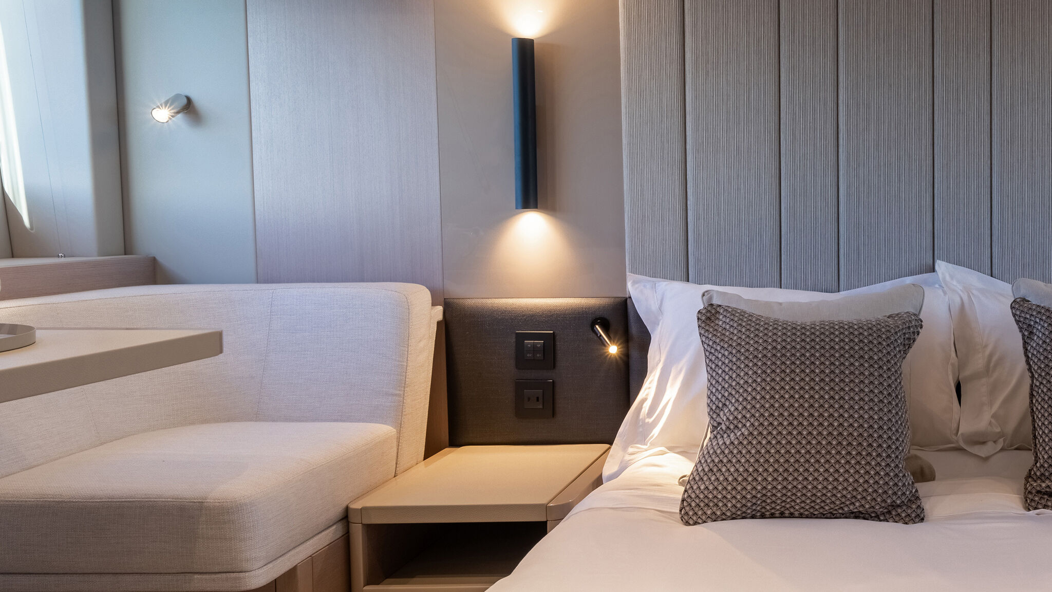 The main-deck galley is thoughtfully positioned to maximise space below, allowing for three well-proportioned cabins. The full-beam master cabin is exceptional for a yacht of this size, offering full-height headroom around a curved king-size bed. To starboard, owners can tailor the space with a chaise lounge, breakfast table or additional storage, while the en suite features recessed lighting, carefully detailed fittings and generous stowage.Throughout the interior, social spaces flow seamlessly, balancing comfort, practicality and understated luxury in equal measure.