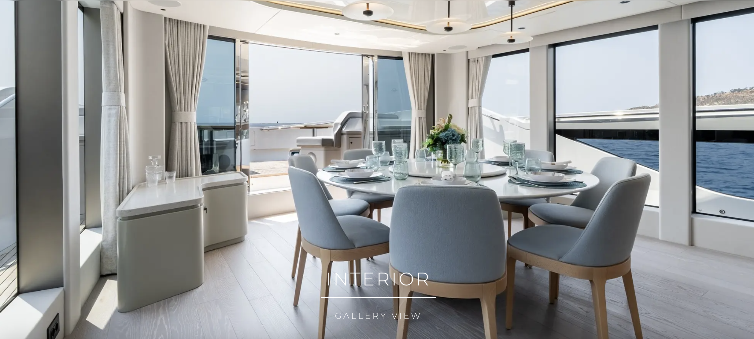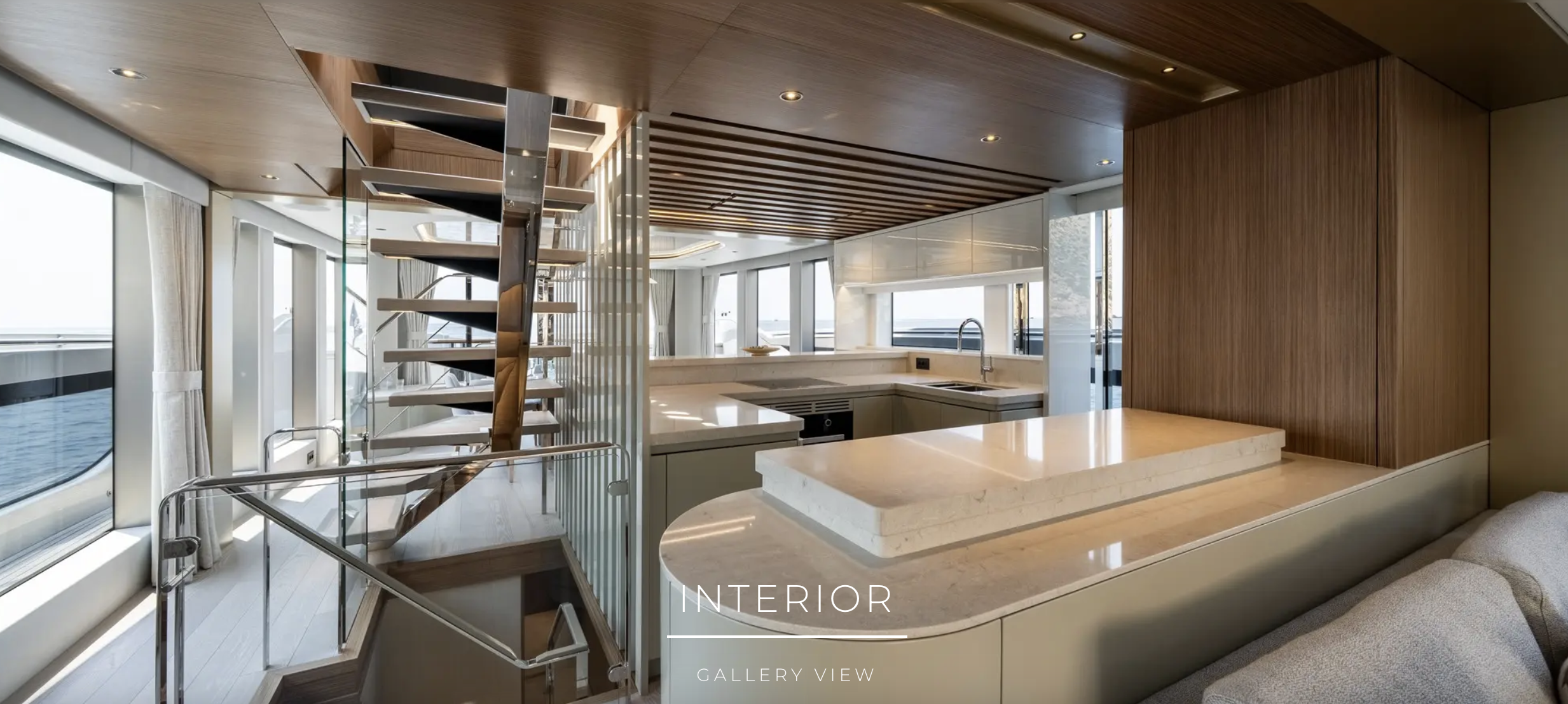 Step into the main deck saloon and you are met with a 360Ëšpanoramic vista owed to the full height and vertical glazing surround. With a luxury penthouse apartment feel, the area can be customised with multiple arrangements including an open galley and dining aft with bar area forward for an open plan set up. Patio doors are situated port and starboard to connect the outside with the stunning interior and an impressive vertical, glazed, floating staircase sits centrally but is subtle so as not to draw the eye away from the impressive settings. Another option for those who favour more privacy, with crew on board, is a central galley layout with options to enclose at varying levels, separating guests and crew. A large saloon sofa seat and TV sits aft with bar and dining forward of the galley and counter-level worktops.