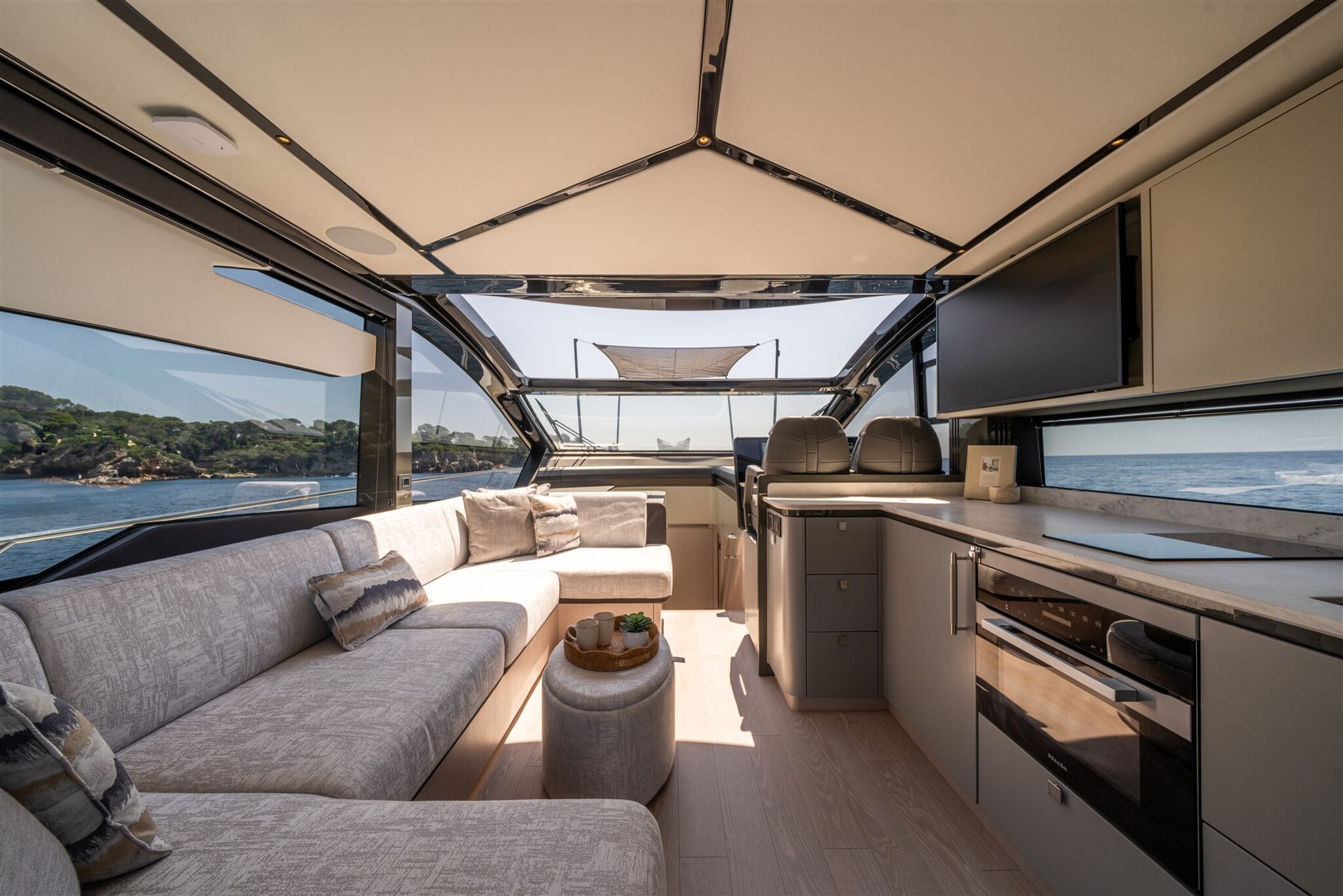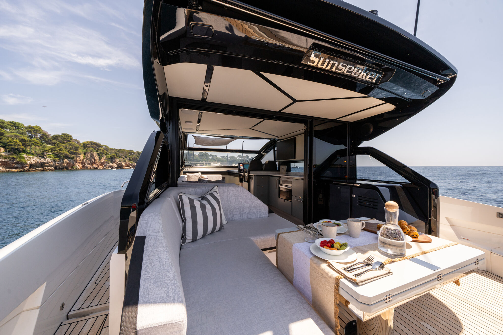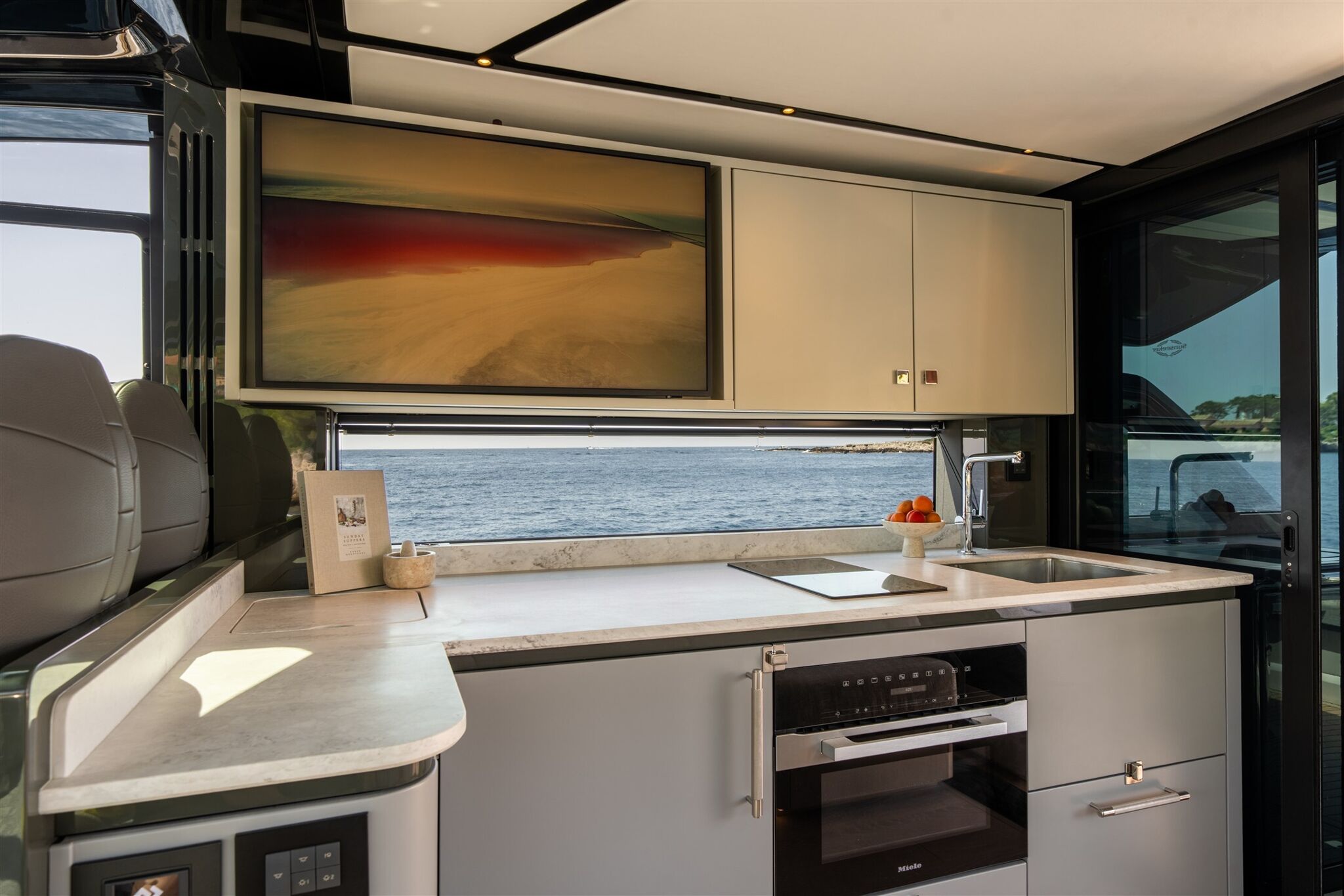 A single-level main deck comprises a generous saloon and L-shaped galley. The galley side units connect with the linear cockpit wet bar so that with the patio door opened to port, there is an uninterrupted connection between inside and outside. Sight lines courtesy of the expansive glazing remain uninterrupted, connecting all on board with the horizon. Twin bolstered seats complement Sunseeker’s exciting new-generation helm station.