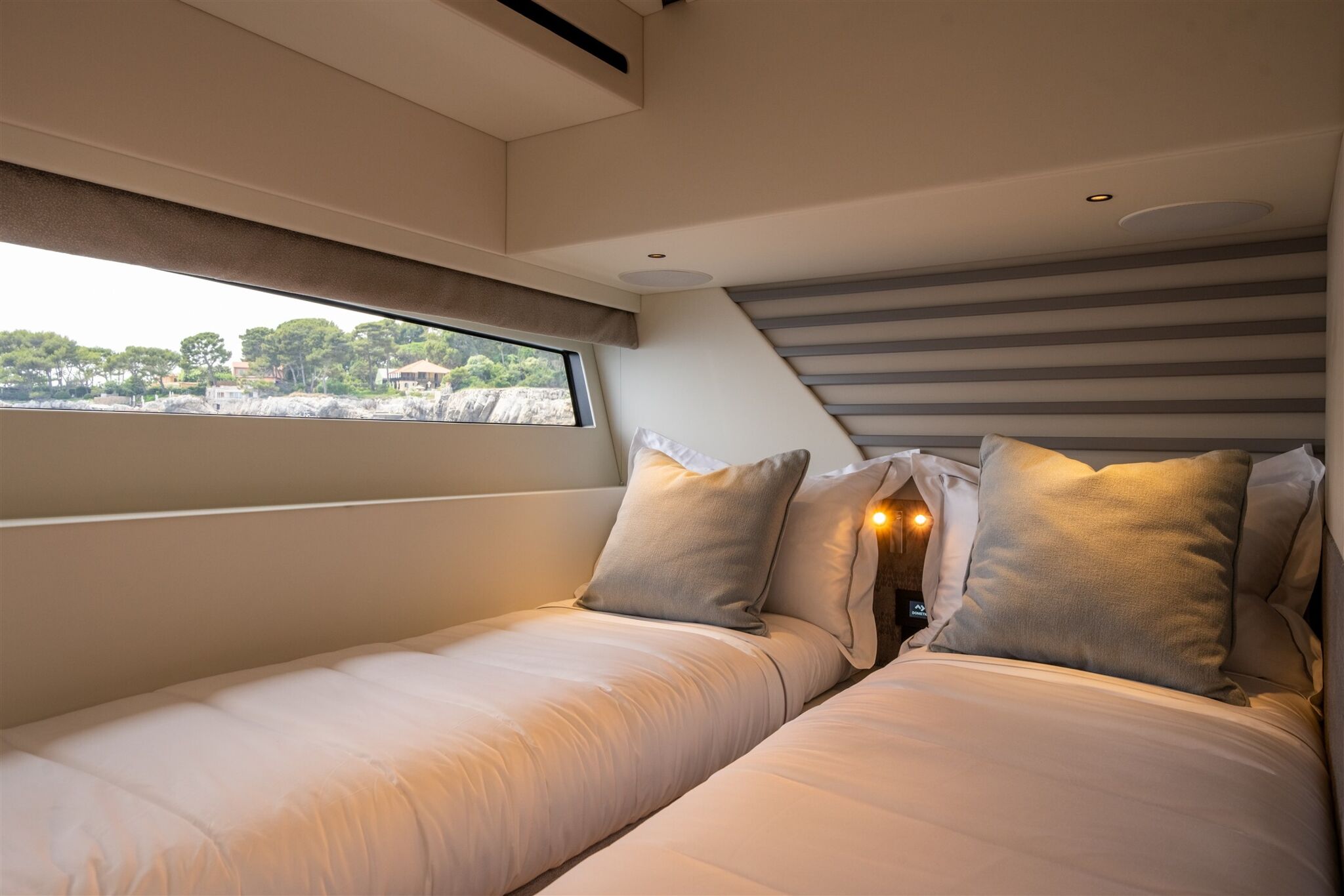 The interior layout can be modified to suit an owner’s exact requirements. The main deck galley can be moved to the lower deck and replaced with a sofa and rise-and-fall TV. With this option, the lower galley replaces the lower saloon and storage or utility room. This space can also be specified as an optional twin cabin with en suite providing accommodation for up to six guests in comfort.