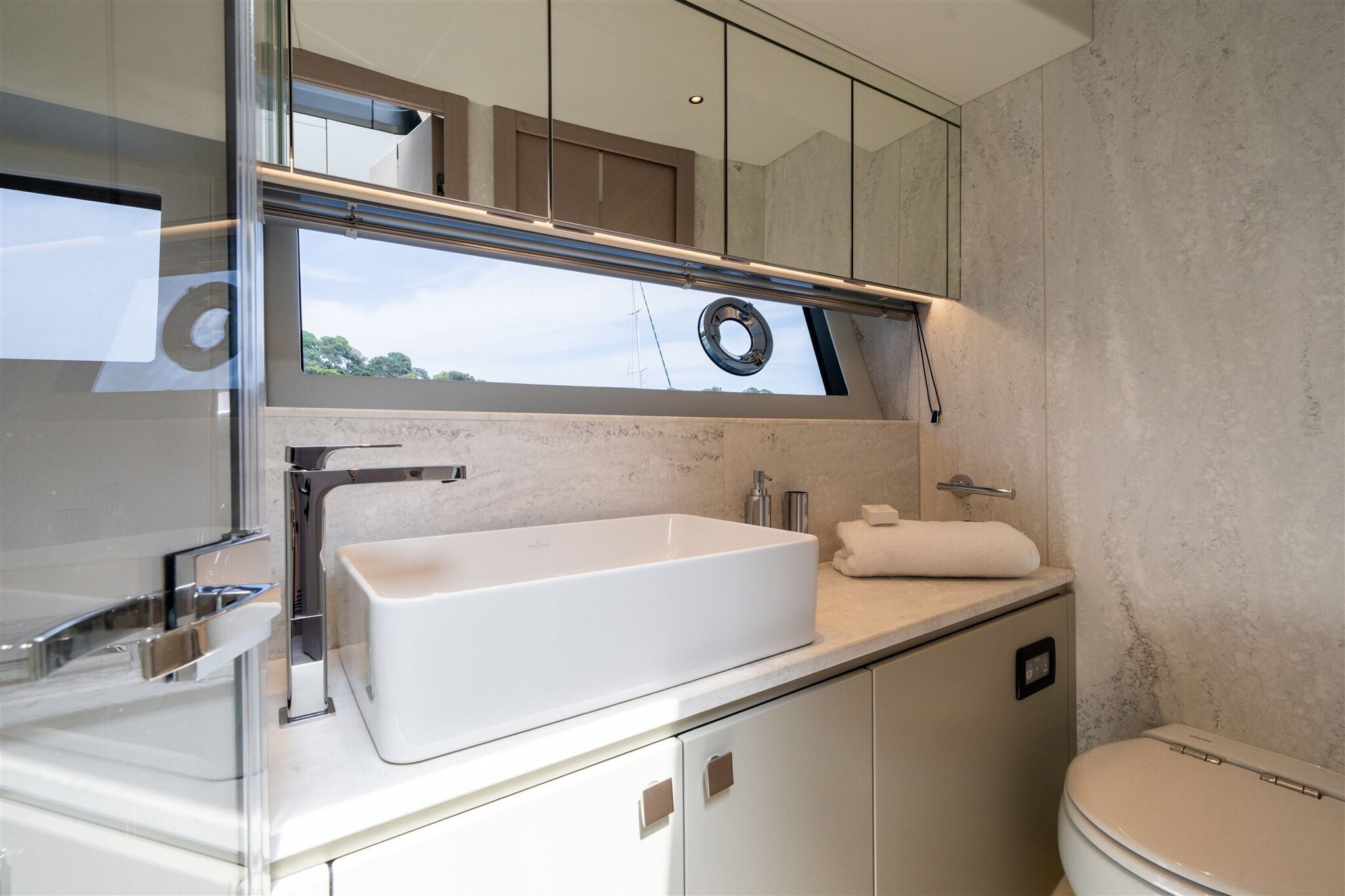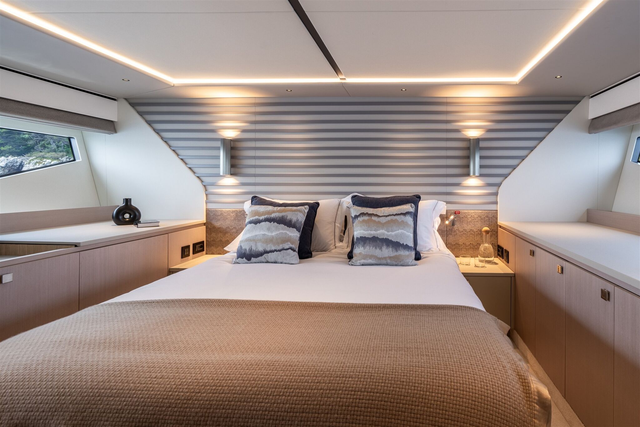 The luxurious full-beam owner's cabin offers generous private quarters. Upon entry to the lobby is a full-height wardrobe to starboard and an extensive en suite to port. The large double bed sits centrally with sofa seating, a sideboard and a second wardrobe outboard whilst a dedicated vanity unit and TV are positioned centrally. An equally spacious forward cabin benefits from an en suite and plenty of storage. With an emphasis on interior volume for long-distance cruising, both cabins benefit from increased headroom, elevating the feel of spaciousness.
