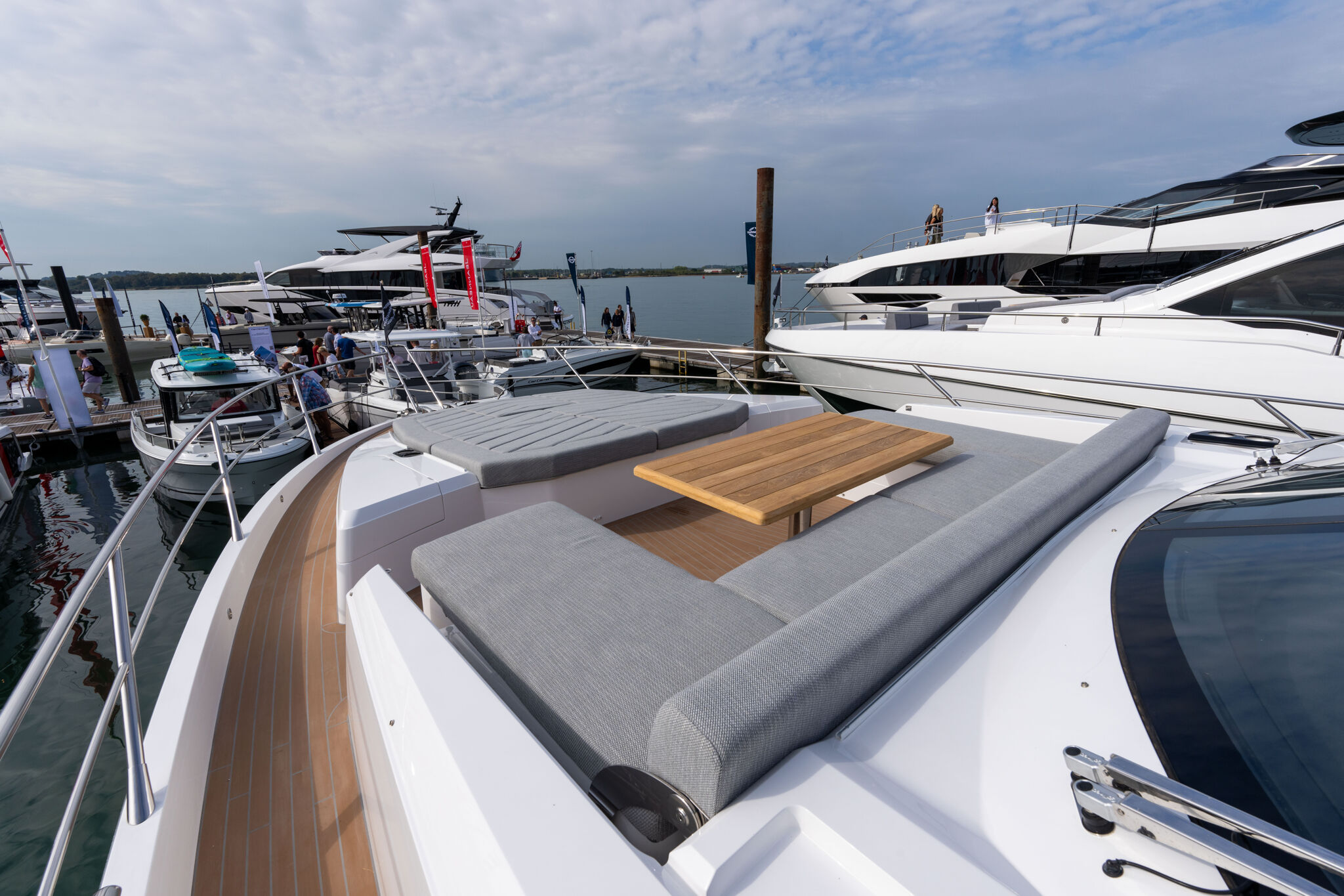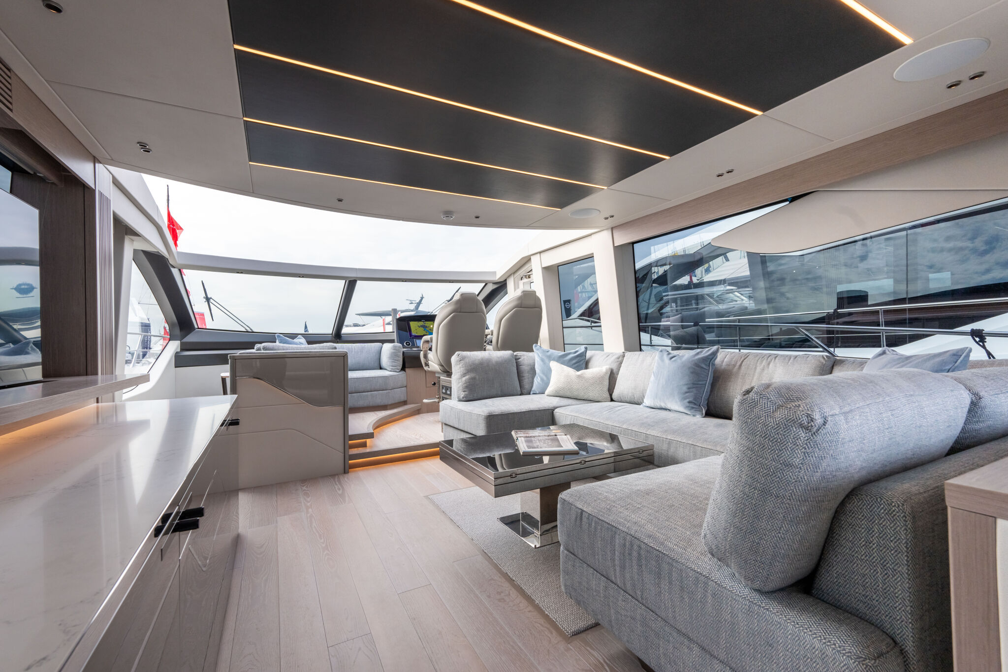 Aesthetic styling is prevalent in every detail. The yacht profile turns heads with stainless steel air intake cowlings and exterior handrails, contributing to the high-quality finish. There is an enhanced material selection, with new exterior upholstery and moulding options. Adventurous buyers will be captivated by a choice of four new grey hull colours. Overall, the exterior is aggressive and imposing, with a new, angular hull and superstructure glazing design.