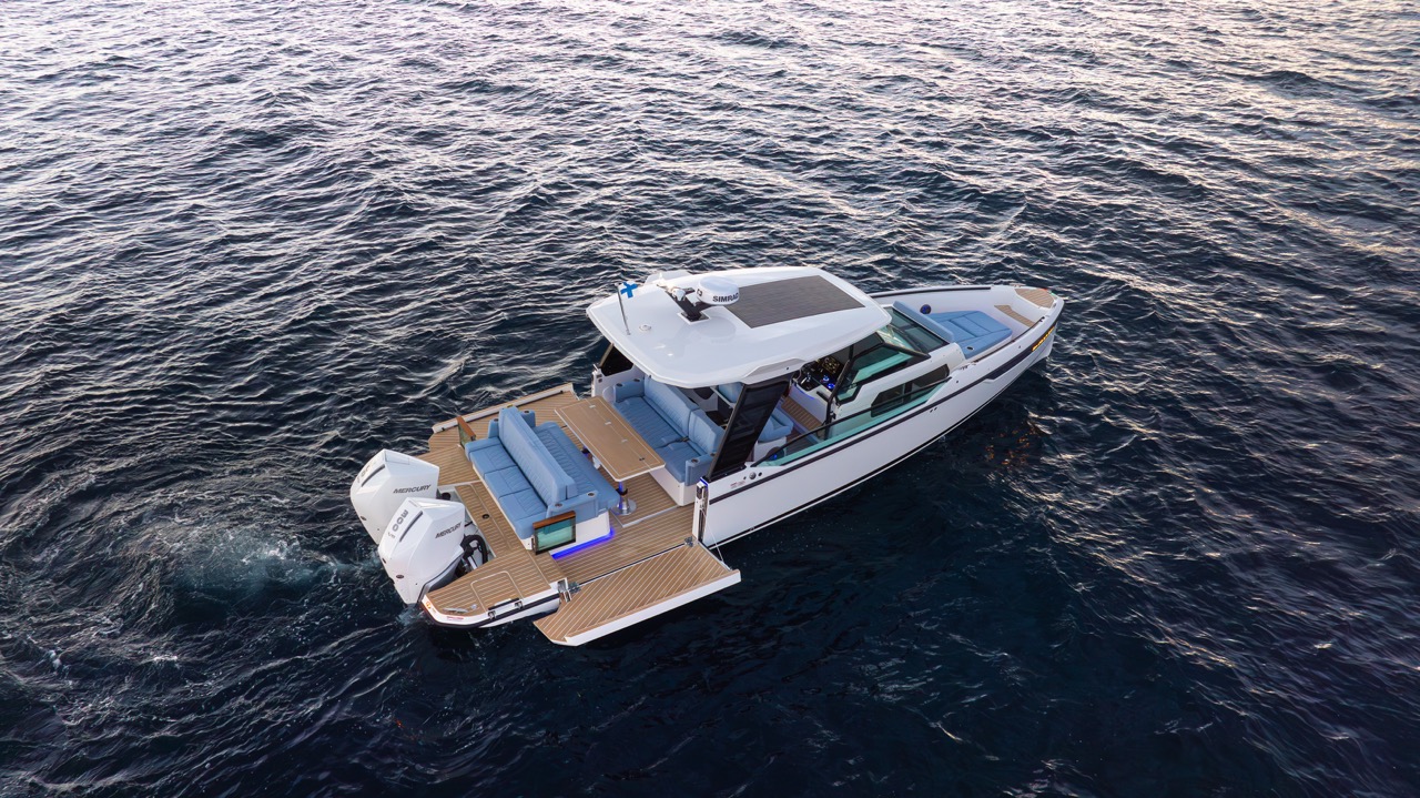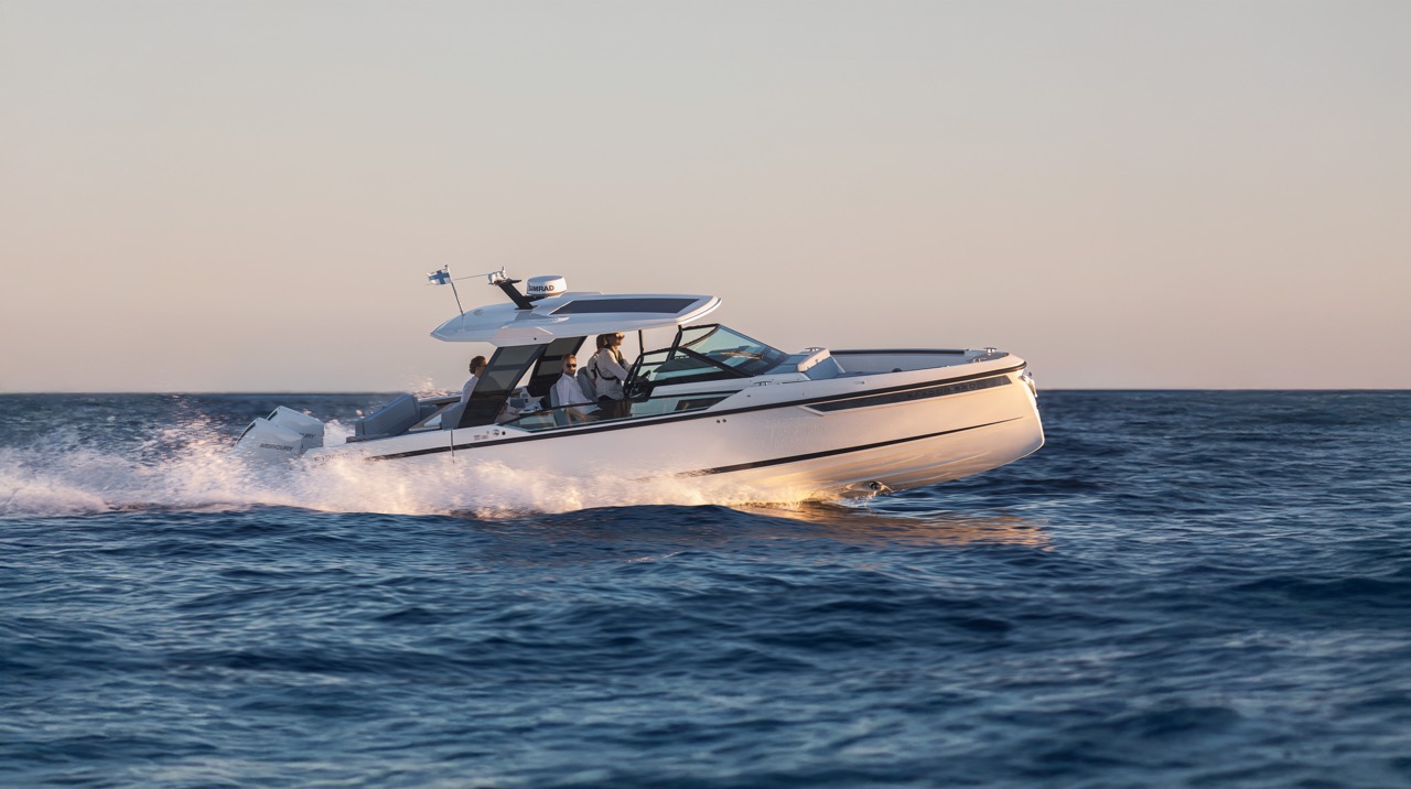 In addition to its excellent drivability, the boat offers much more. It features a great socializing space, a full cabin for napping or spending the night, and a well-equipped galley kitchen for preparing lovely, lazy breakfasts and a huge cockpit area, especially when the fold down balconies are deployed.