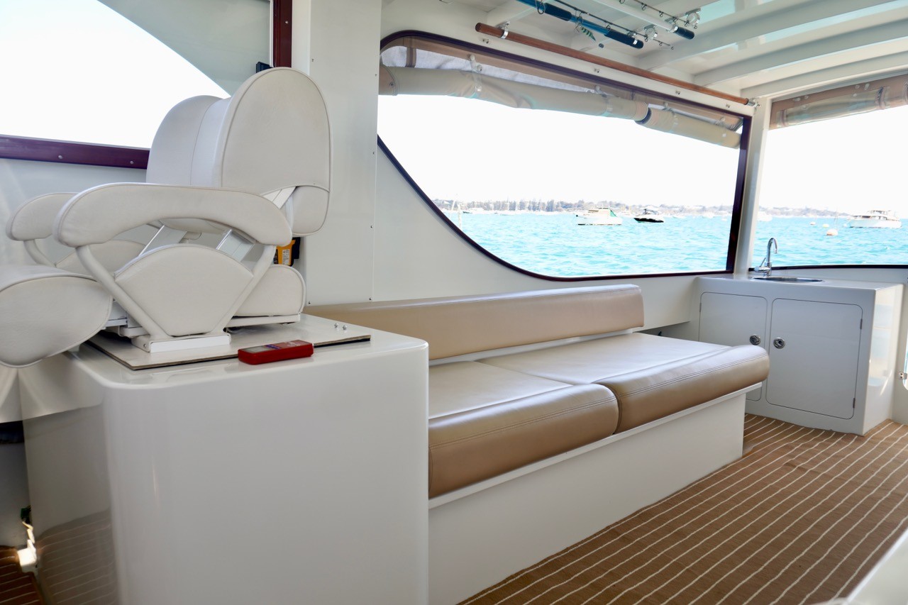 Sleeping: Island double berth forward; two large singles in wheelhouse; two singles in lower saloon — total 1 double + 4 singles.