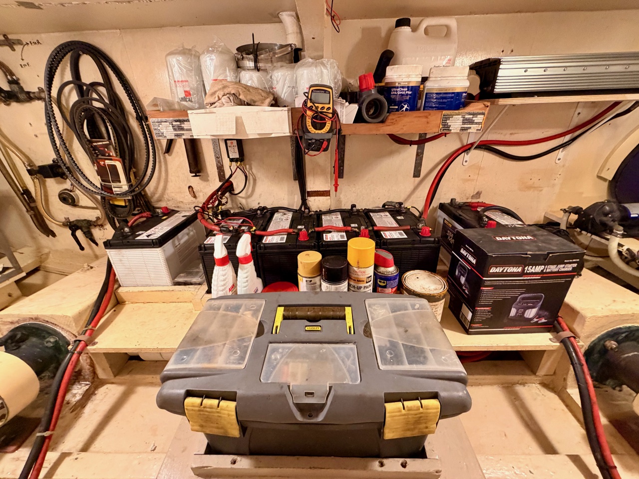 The generous sized cockpit has beautiful timber decks, and has storm covers & clears to protect from the elements. The helm is very well laid out with everything at the skipper’s fingertips as well as adjustable floor height for sitting or standing, clear view windscreen and the same comfortable leather on the double helm seat as the saloon lounges. It also boasts full electronics suite with Lowrance HDS10 GPS, radar, fluxgate compass, autopilot, sounder, log, 27Mhz and VHF radios. With good access; the engine room is impeccably clean as are the twin yellow Caterpillars that have been maintained and serviced regularly .