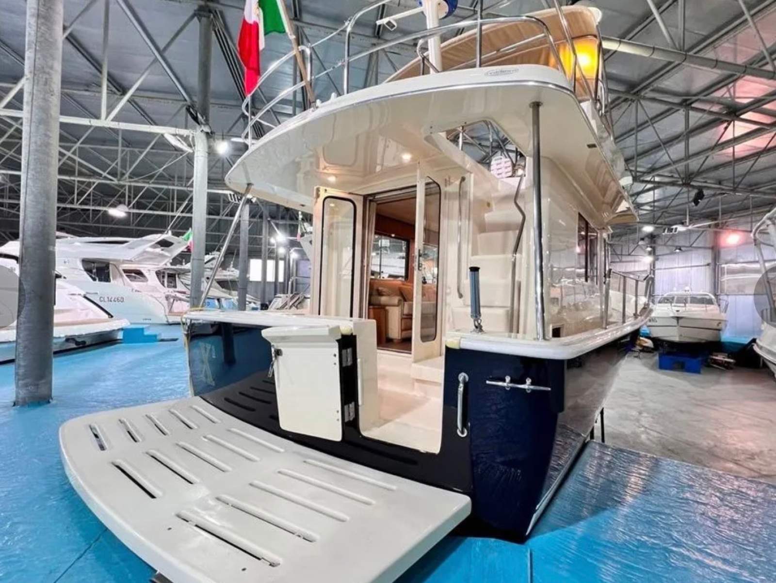 This twin engined trawler is built on a semi displacement hull that features a full keel.
