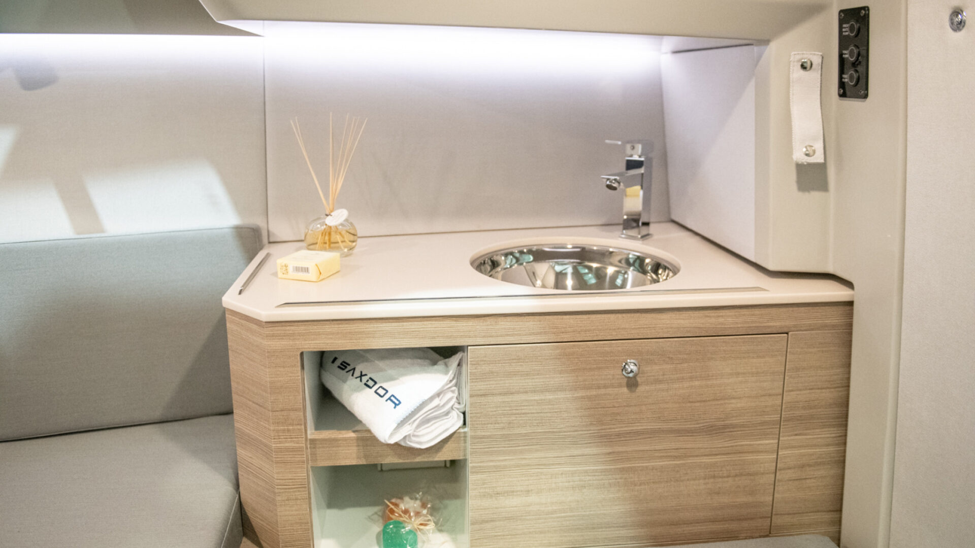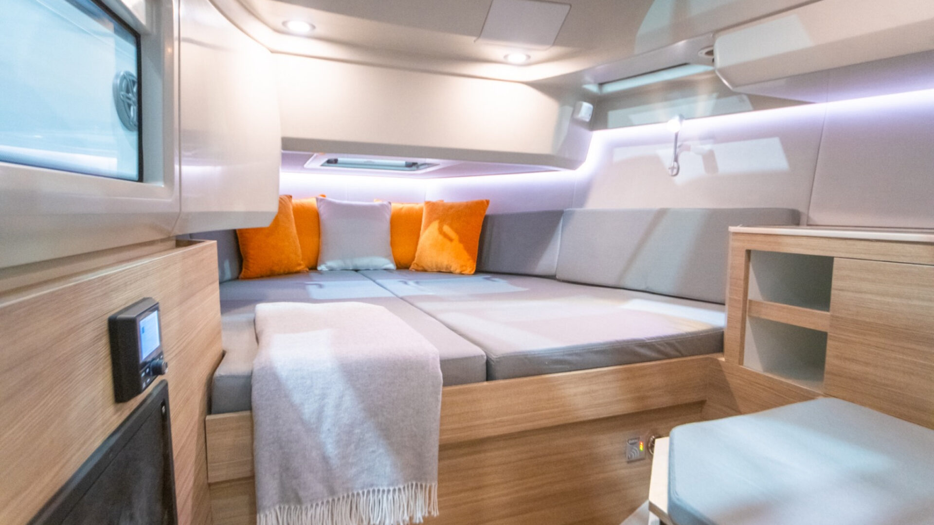 Flexible cockpit layout with twin sofas converting into a sun pad, plus hidden storage and optional fridge.