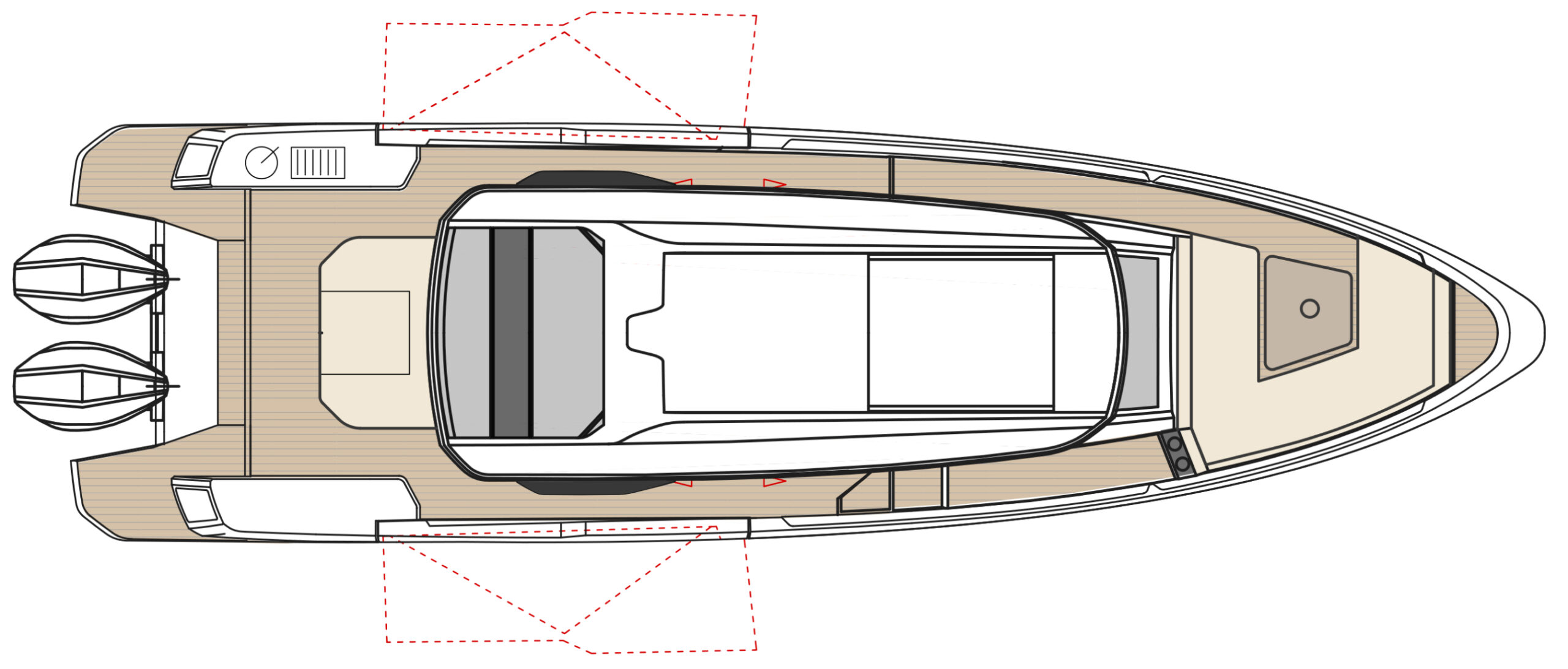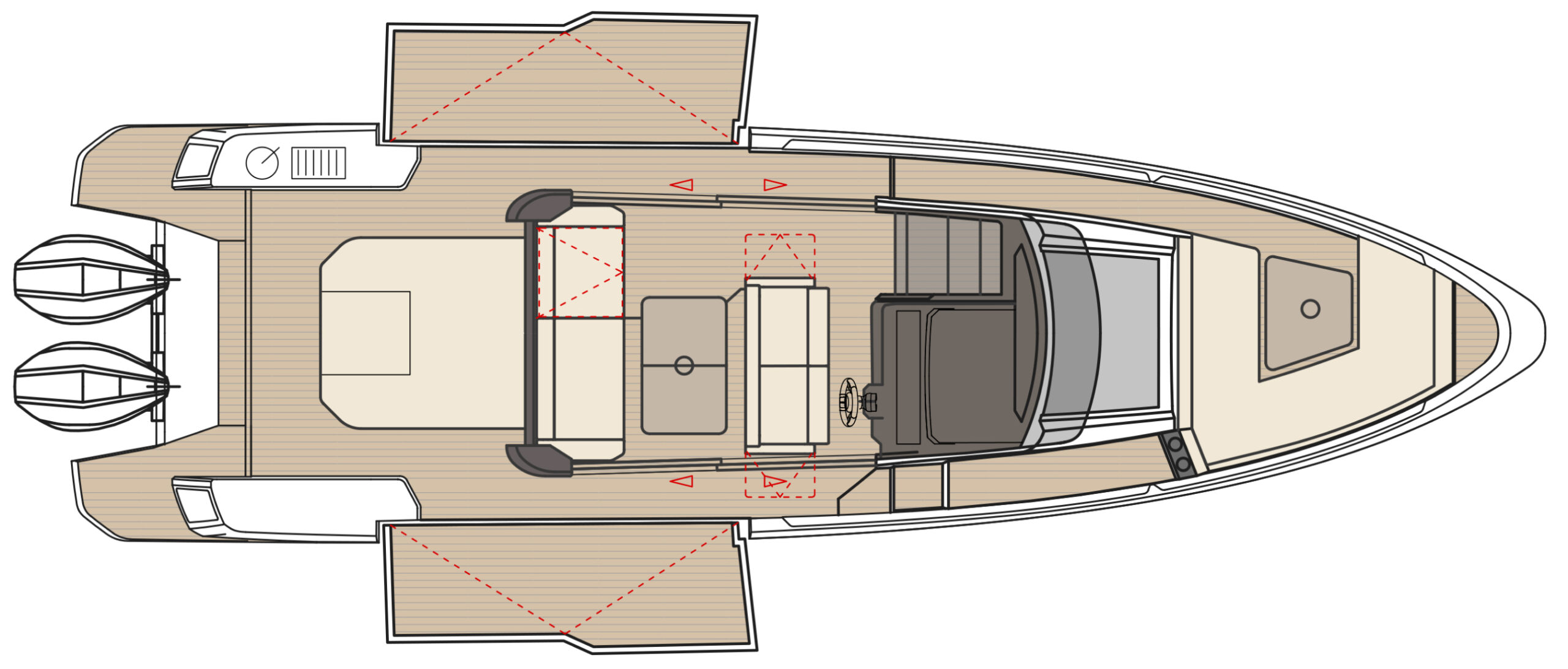 The bright wheelhouse, with large glass sliding doors and roof, invites an abundance of sunlight while further enhancing the ease of movement. The ergonomic helm station features a front sofa for three, ensuring great visibility and comfort. While at rest the sofa can be turned to create a cozy dinette, perfect for indoor socializing.