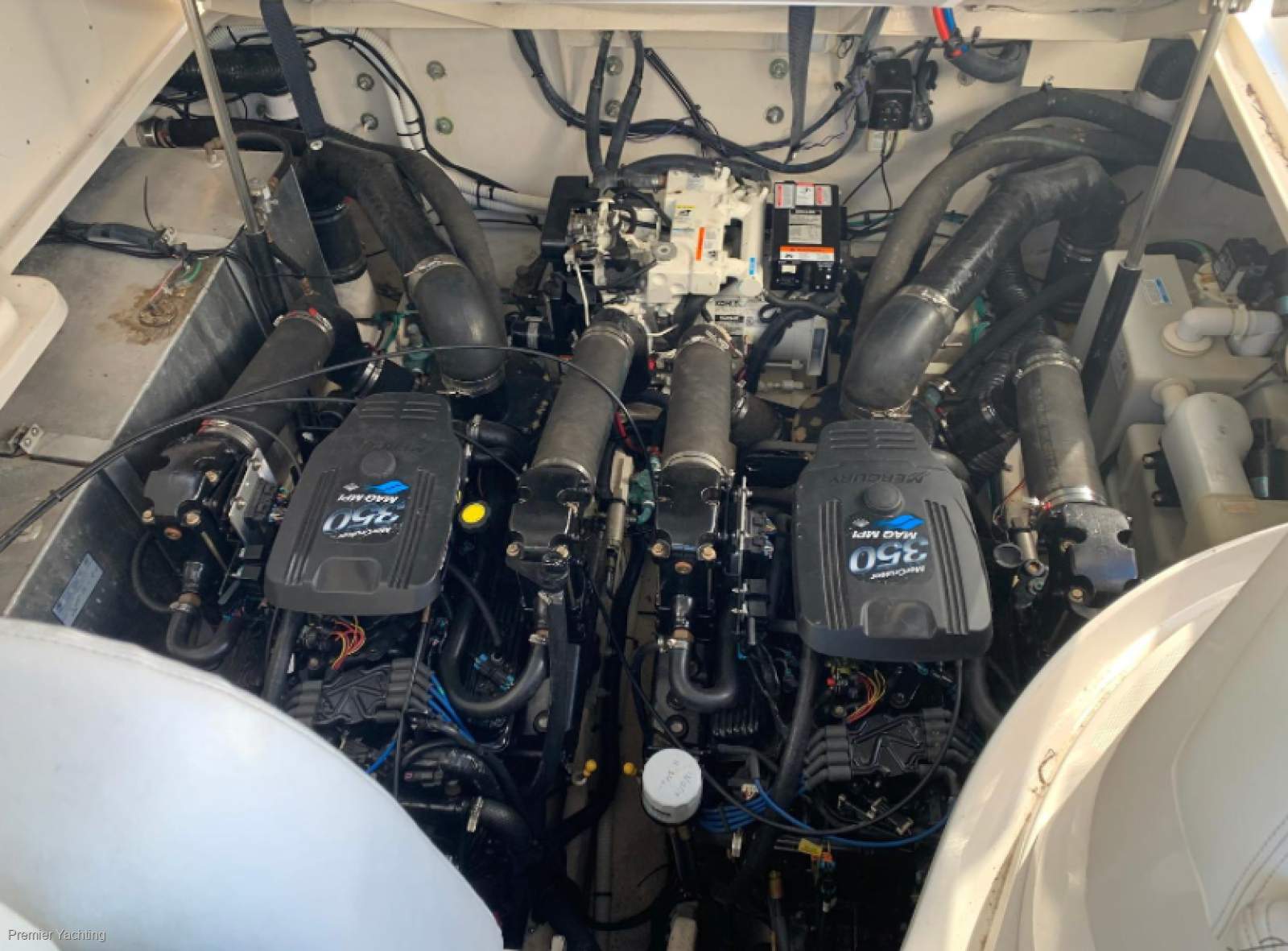 Twin 350 hp MAGNUM MPI MerCruiser engines (shaft drive) with only ~470 hours each deliver strong, reliable performance. Twin shaft drives with both bow and stern thrusters offer effortless close-quarters handling.