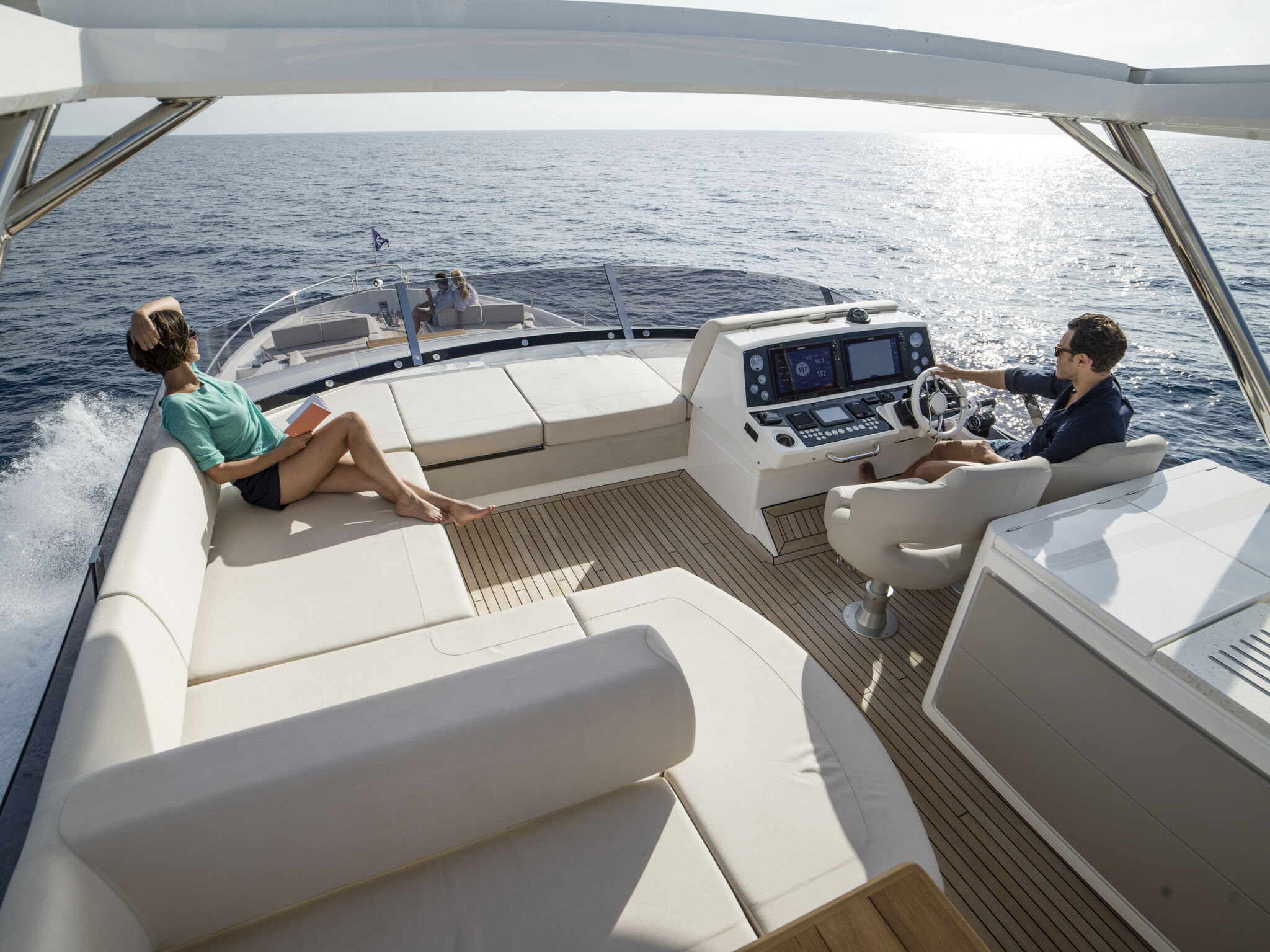 The cockpit can be adapted to include additional lounge seating or a cocktail bar. At the stern, enjoy the addition of a mini beach club, complete with a barbecue grill, fold-out seating and a rain shower, perfect for entertaining family and friends. Make the most of the extended bathing platform, which can accommodate a Williams 445 tender, SeaBobs, and more. The impressive layout of the 76 Yacht continues on the foredeck, where large twin sunbeds, fore/aft seating and optional refrigeration ensure space maximisation for any social occasion.