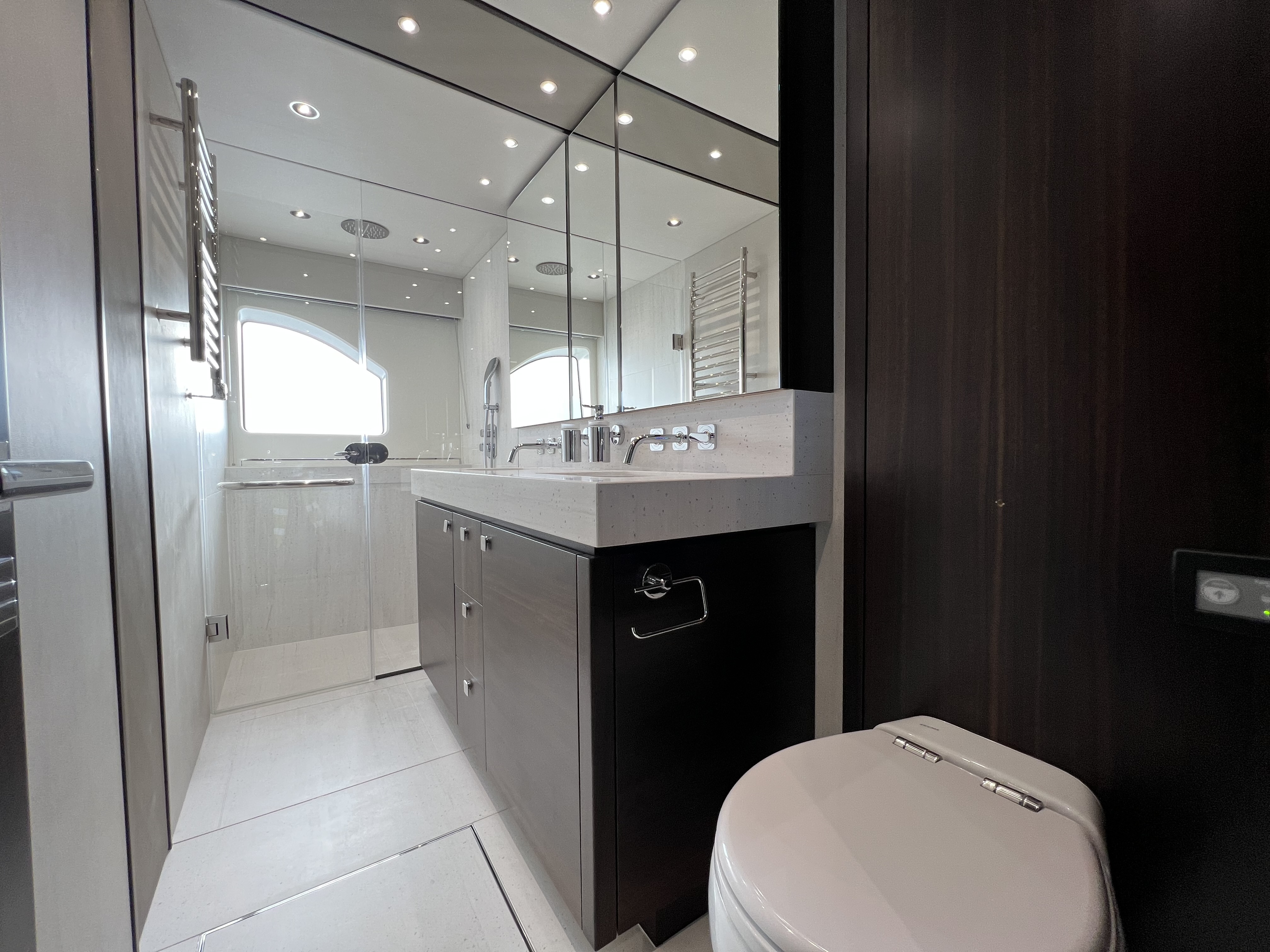Not only does this model cut an impressive silhouette on the horizon, but an expanse of glass and sunlight also welcomes you onboard the 76 Yacht, and the main deck allows you to entertain with an almost 360-degree view of your surroundings. For ‘al fresco’ life, this flybridge yacht provides unprecedented levels of space and flexibility to suit owner needs. On the flybridge, choose a spa tub, jet-ski with crane or additional sunbeds to maximise this space. Complement the superyacht feel with any number of layouts.